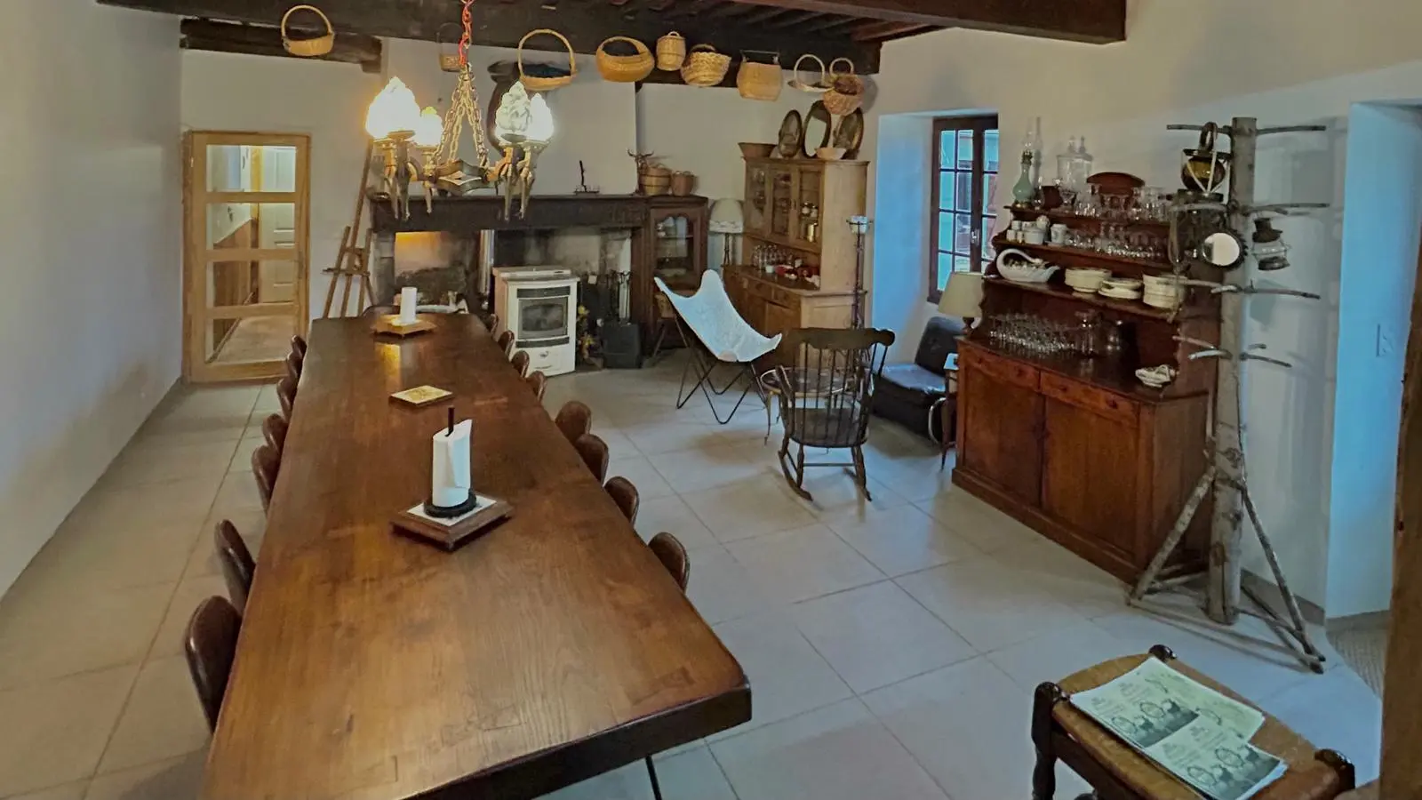 Juste à côté, une grande table en bois rassemble tout le monde pour des repas conviviaux, des échanges, ou simplement des moments partagés.