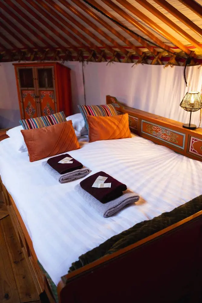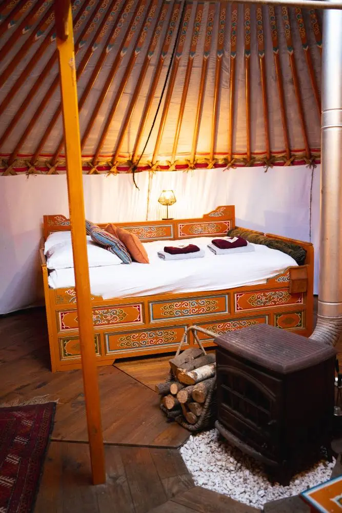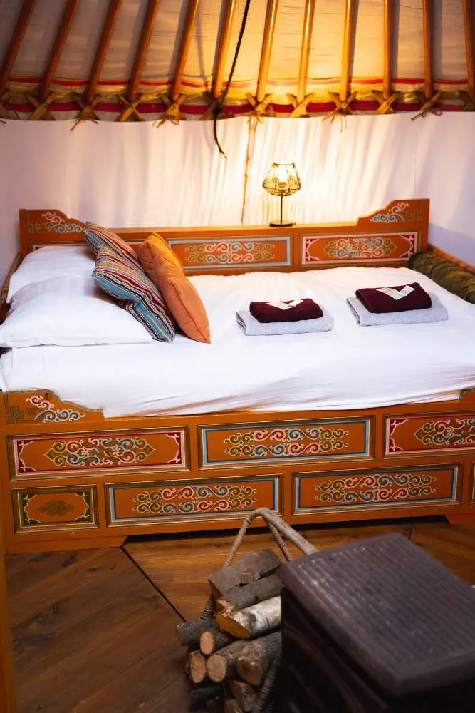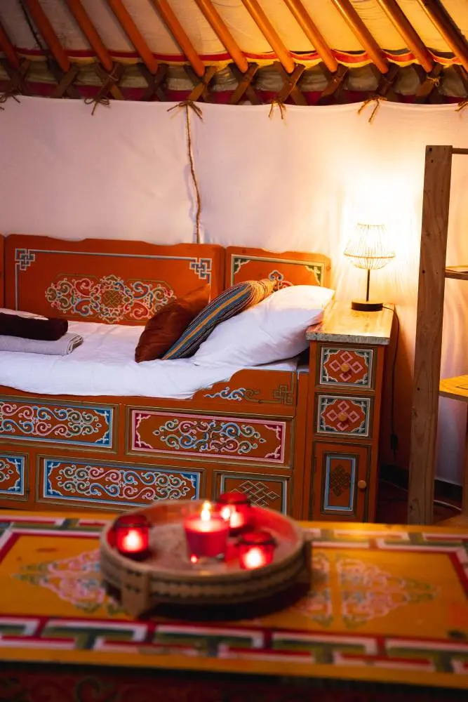 Conçue spécialement pour les couples, cette « yourte des amoureux » offre un espace chaleureux et cocooning, parfait pour des moments romantiques à deux. Draps douillets et serviettes de bain sont inclus, assurant un séjour relaxant et sans soucis.